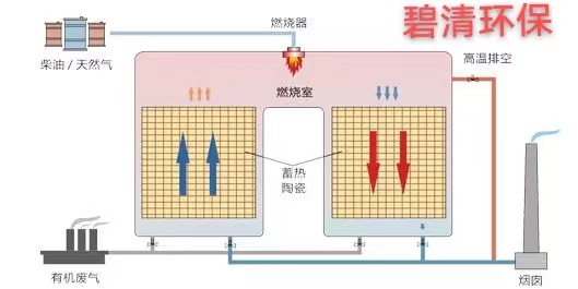 其原理是把廢氣加熱到760攝氏度以上,使廢氣中的VOC在氧化分解成二氧化碳和水。氧化產(chǎn)生的高溫氣體流經(jīng)陶瓷蓄熱體,使陶瓷體升溫而“蓄熱”,此“蓄熱”用于預熱后續進(jìn)入的廢氣。從而節省廢氣升溫的燃料消耗。陶瓷蓄熱體應分成兩個(gè)(含兩個(gè))以上的區或室,每個(gè)蓄熱室依次經(jīng)歷蓄熱-放熱-清掃等程序,周而復始,連續工作。蓄熱室“放熱”后應立即引入部分已處理合格的潔凈排氣對該蓄熱室進(jìn)行清掃(以VOC去掉率在以上),只有待清掃完成后才能進(jìn)入“蓄熱”程序。